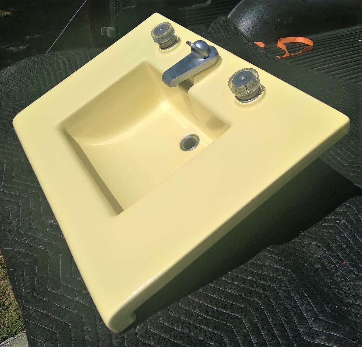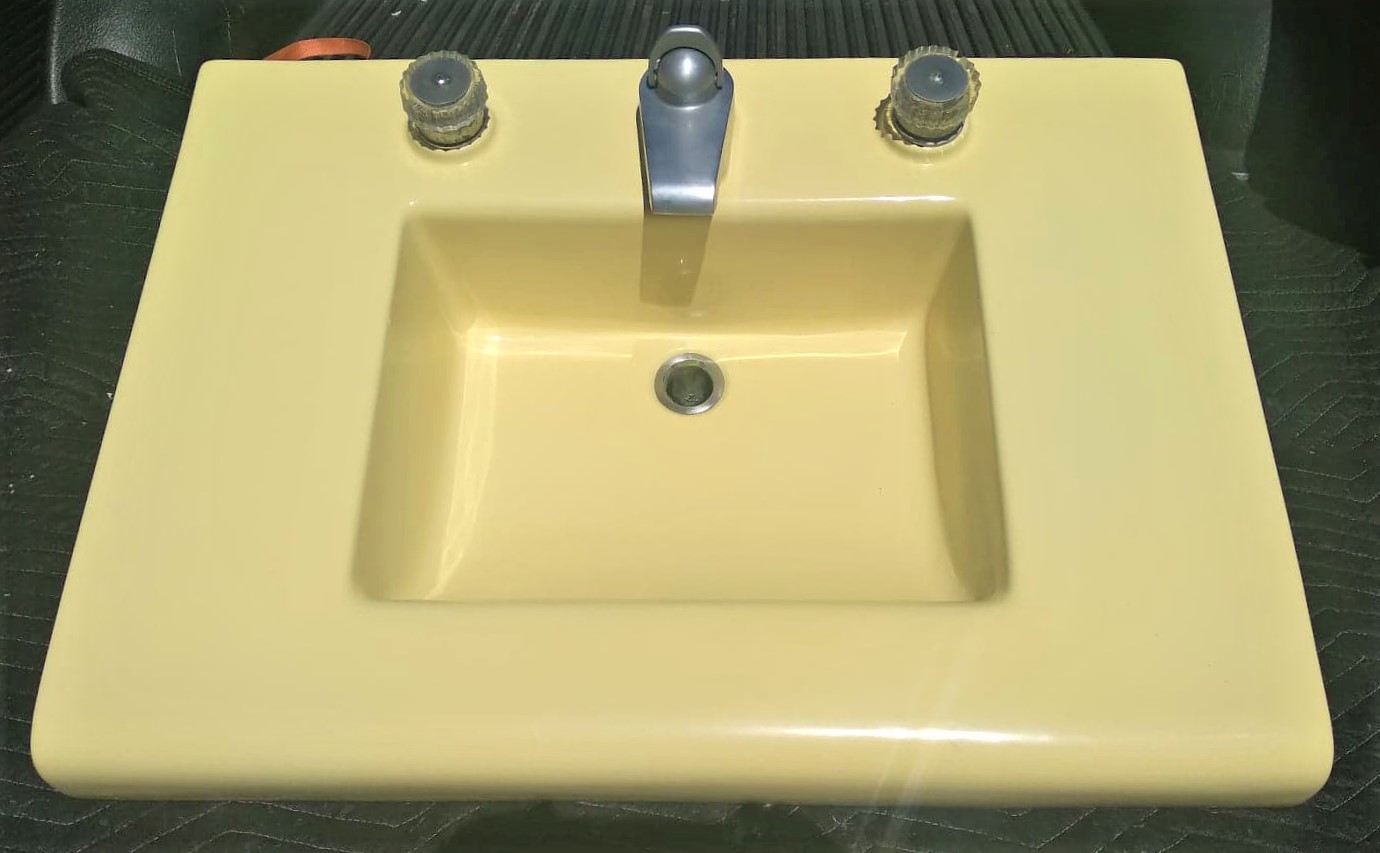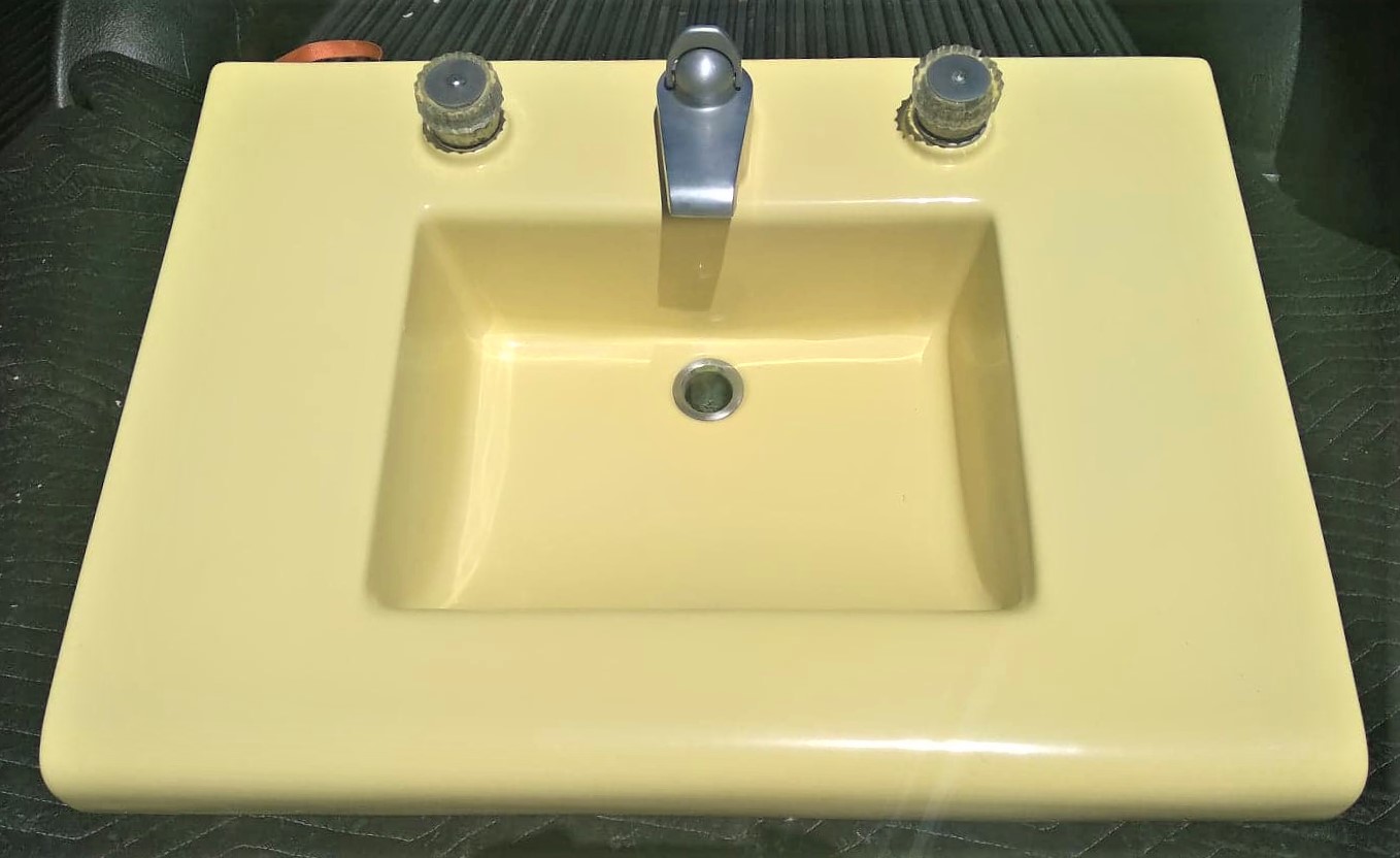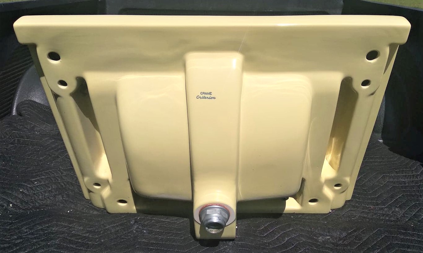 Henry Dreyfuss Design- VERY RARE, Crane Criterion Bathroom Console Sink (Citrus Yellow porcelain with original faucet set).
