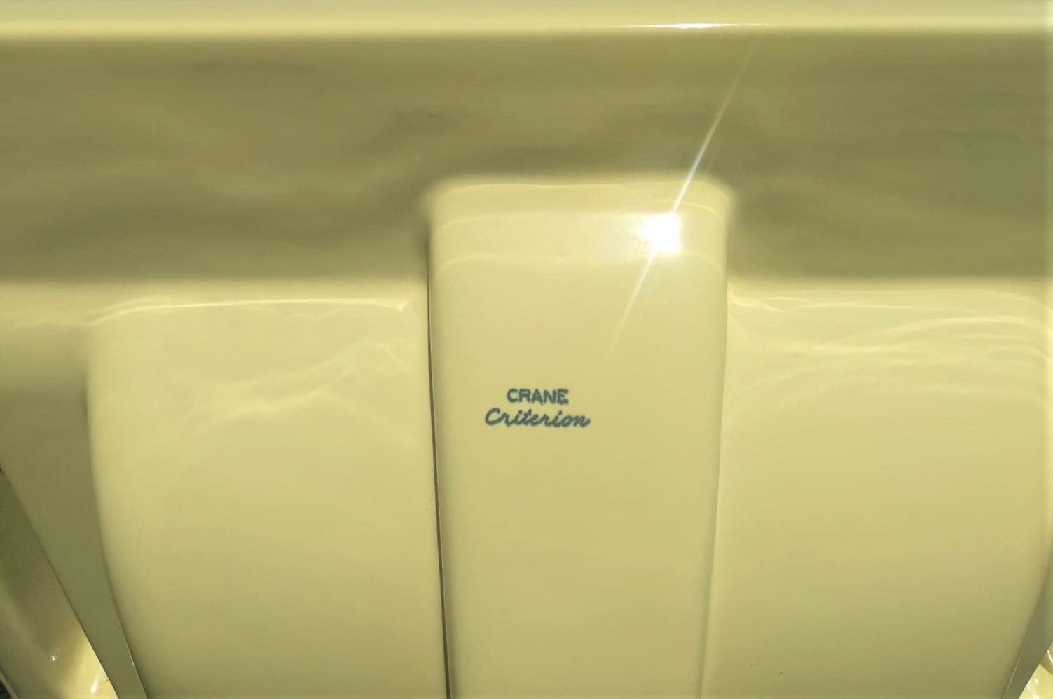 This is a genuine, original Crane Criterion porcelain sink from 1956 designed by Henry Dreyfuss. It is in perfect original condition, with original streamline design faucet valves, spout and strainer. This sink includes a pair of legs. Based on the brochure, these sinks were offered as drop in or leg mounted. The option to do either, still remains with this unit.