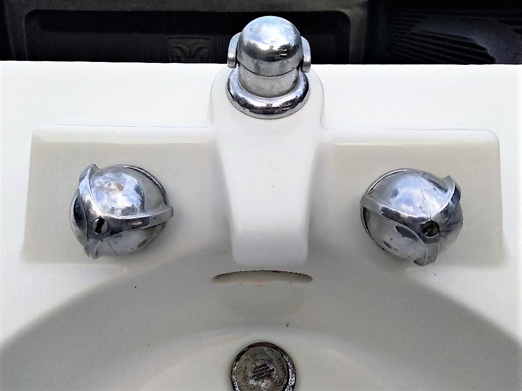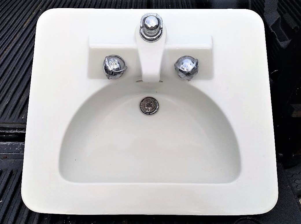 This is a wonderful 1950 Crane Marcia model sink designed by Henry Dreyfuss with integral water spout and domed handles. It is made of Vitreous China in the old Trenton Potteries factory!. Included with this are the original “Dial-ese” faucets! We believe this was in good working order when removed, but cannot guarantee it proper functioning. We would certainly recommend going through the faucets before use. DEA Machineries has most parts for these if needed.
