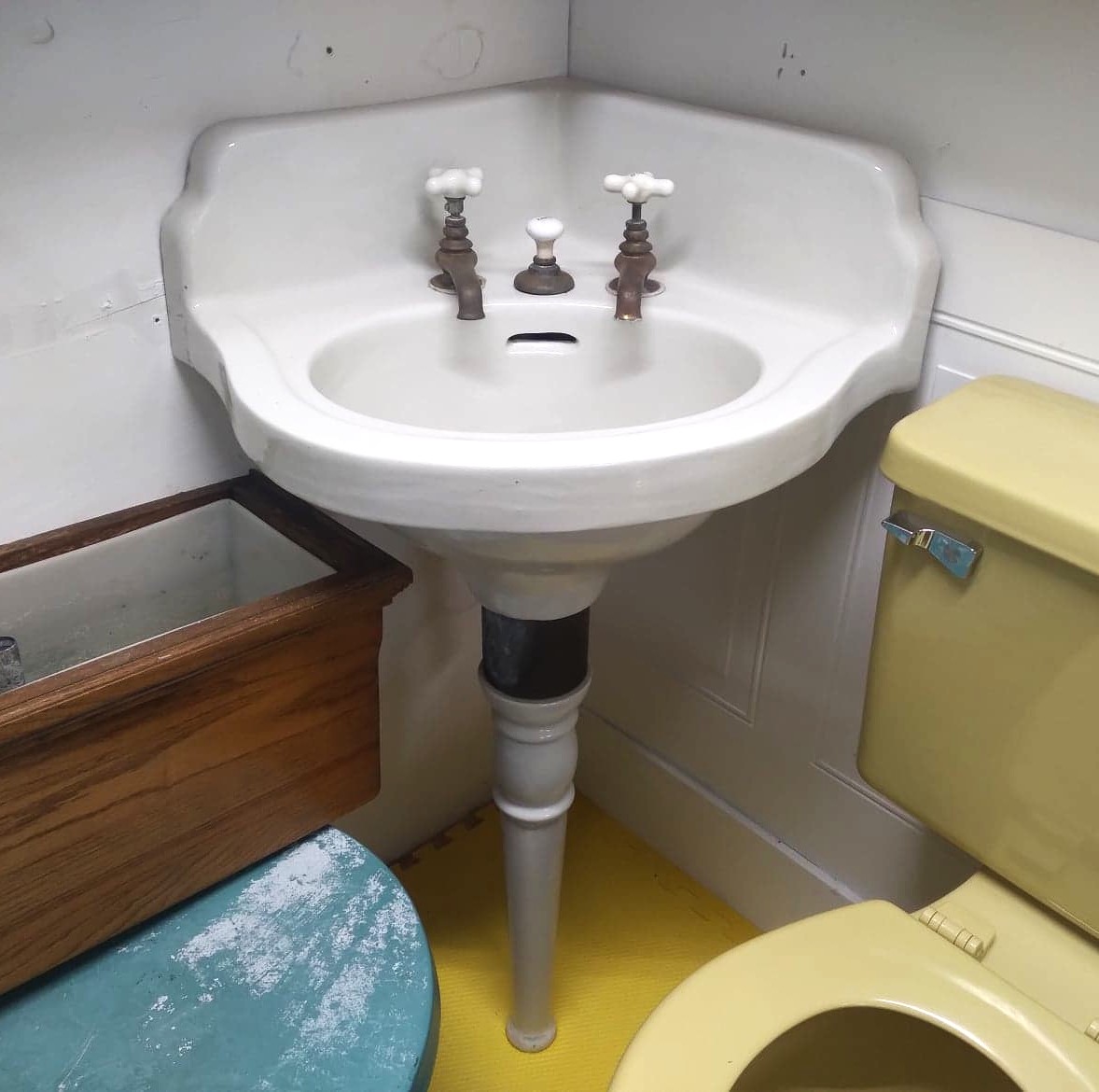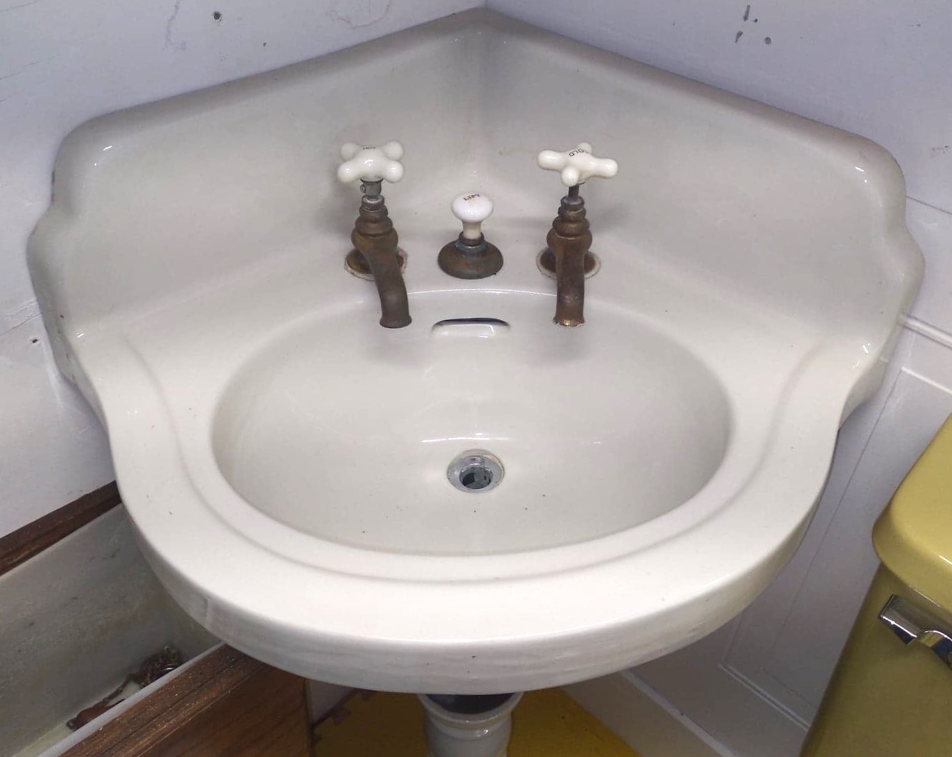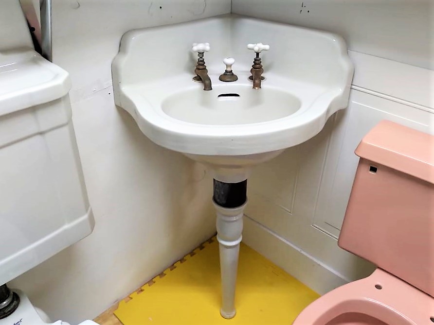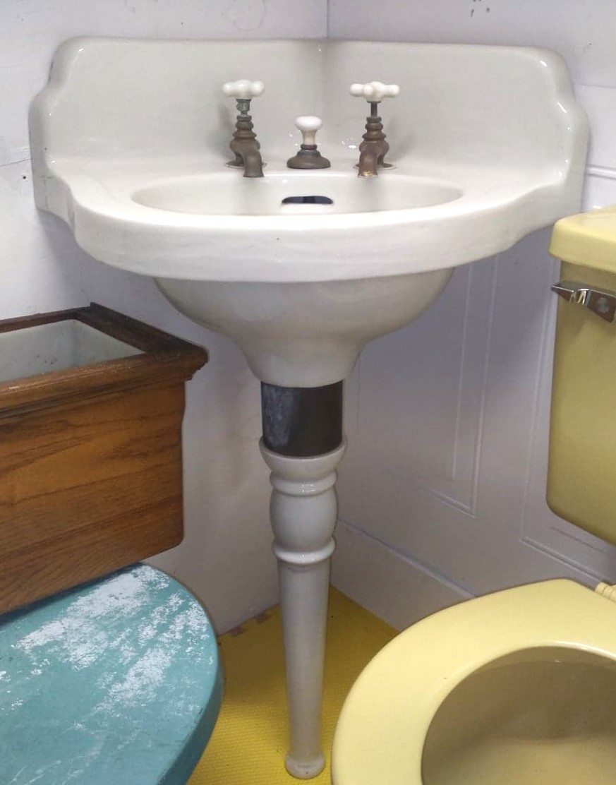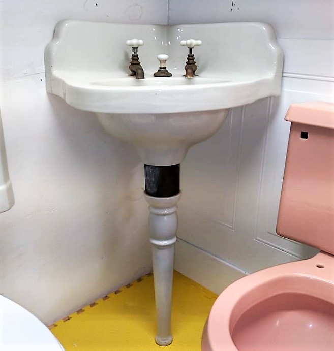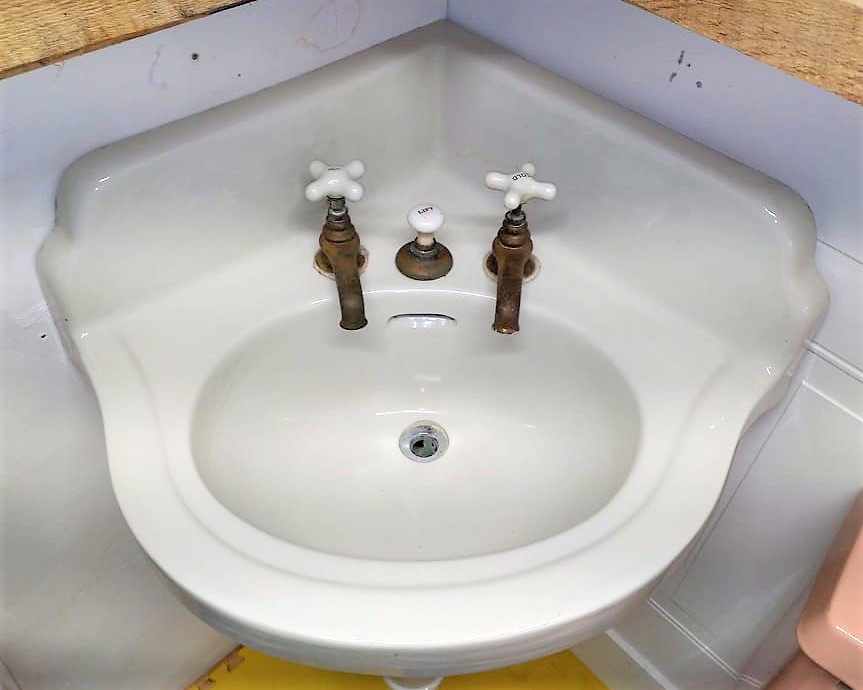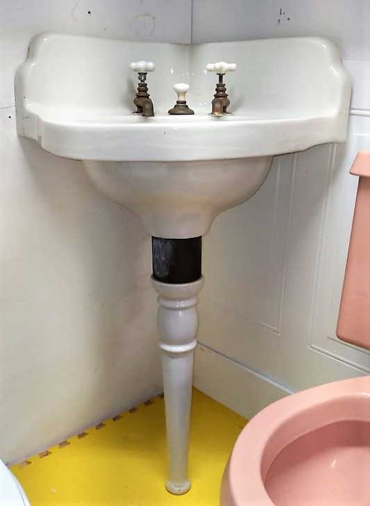 Outstanding Antique Peg Leg Corner Sink with original faucets and drain!