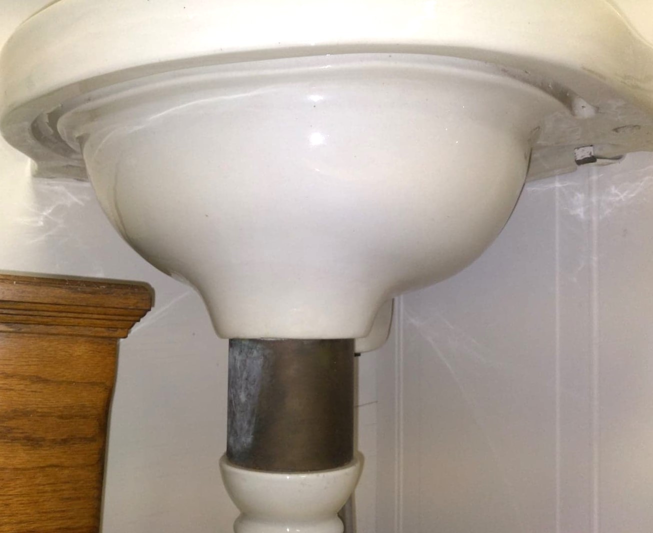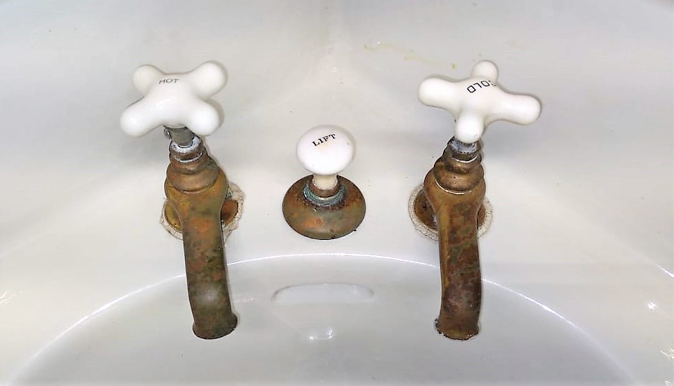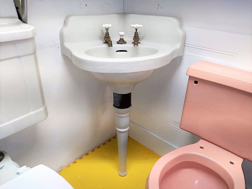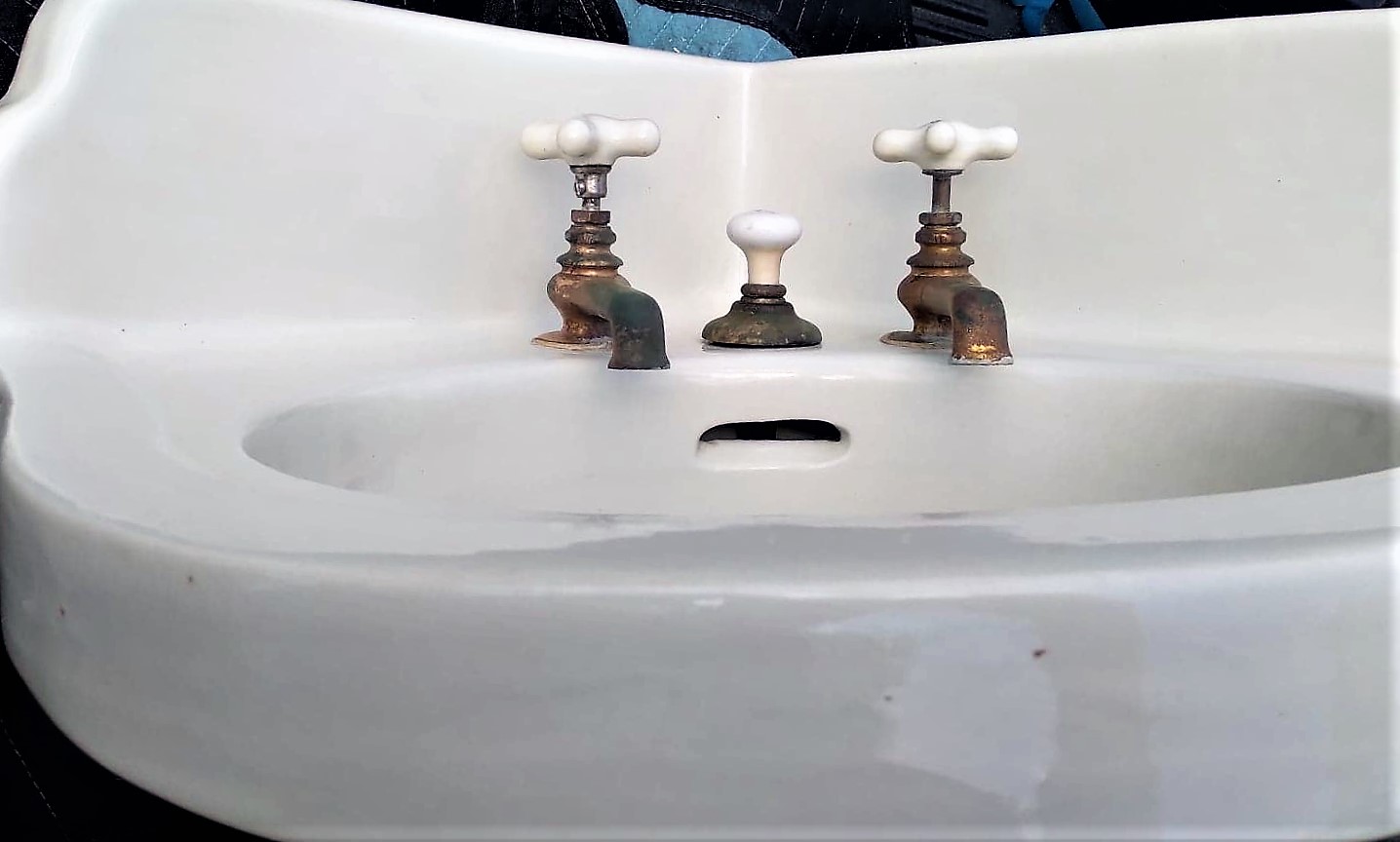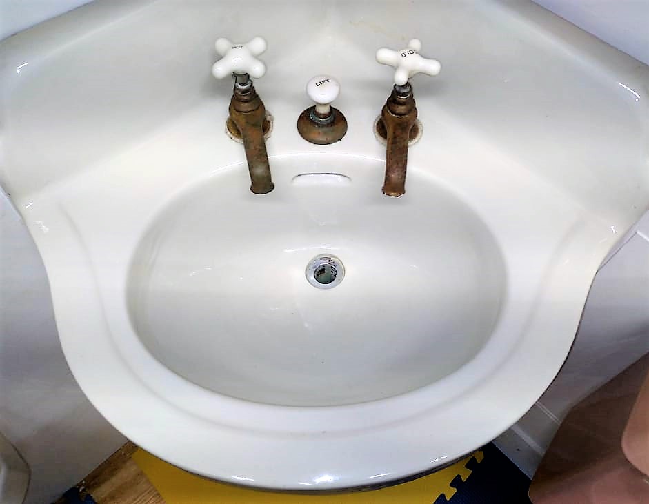 Outstanding Antique Peg Leg Corner Sink with original faucets and drain!