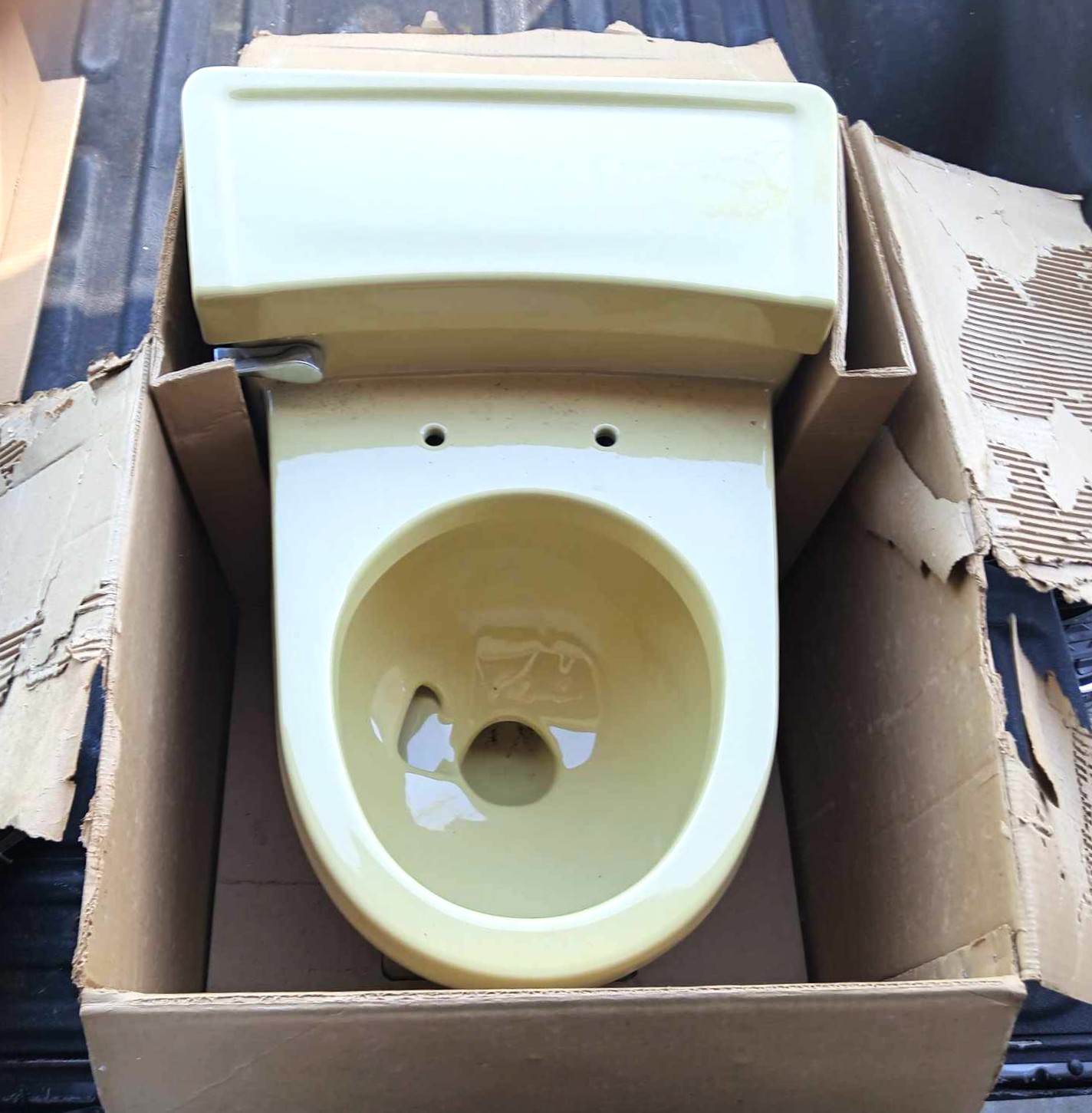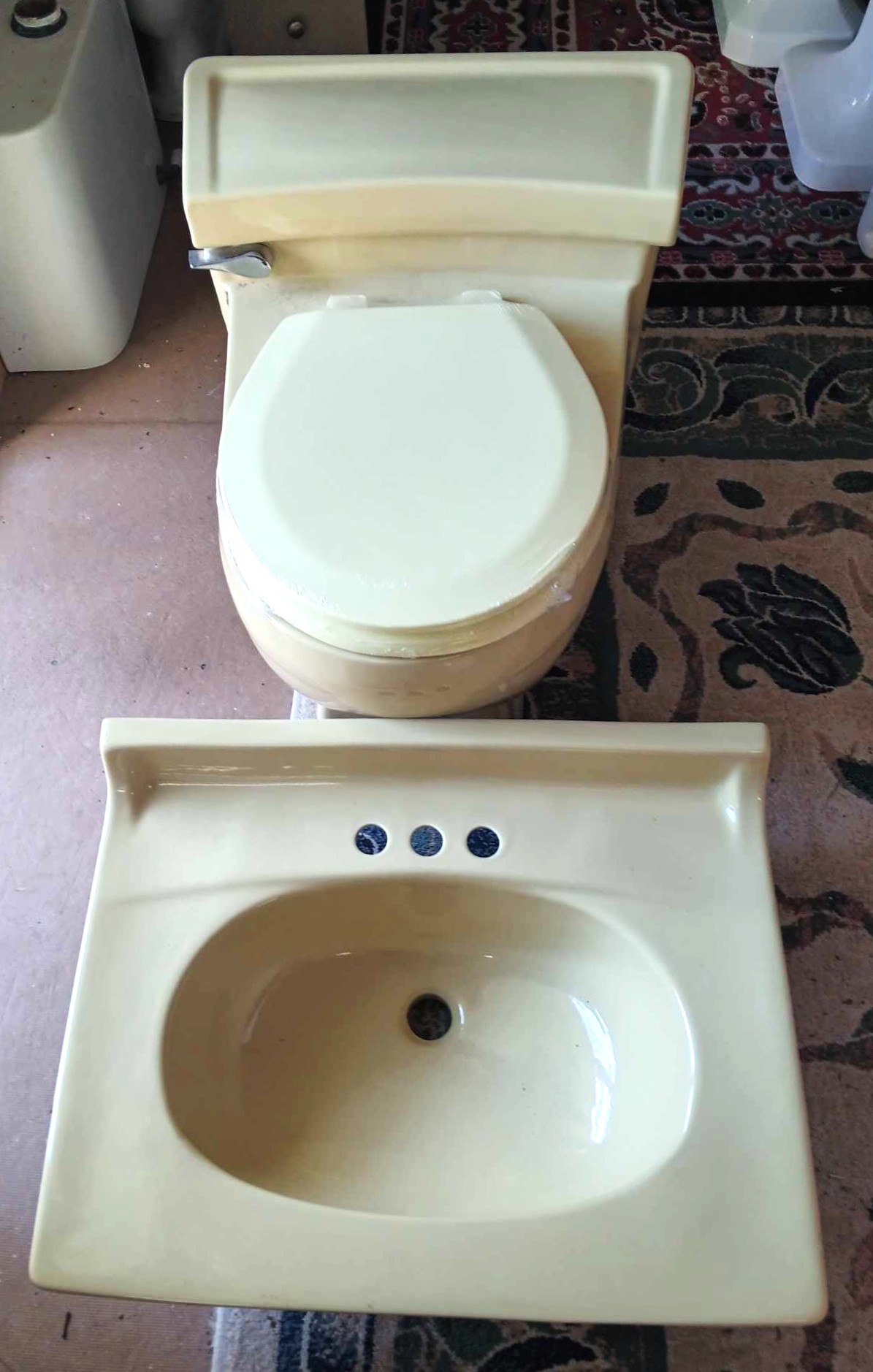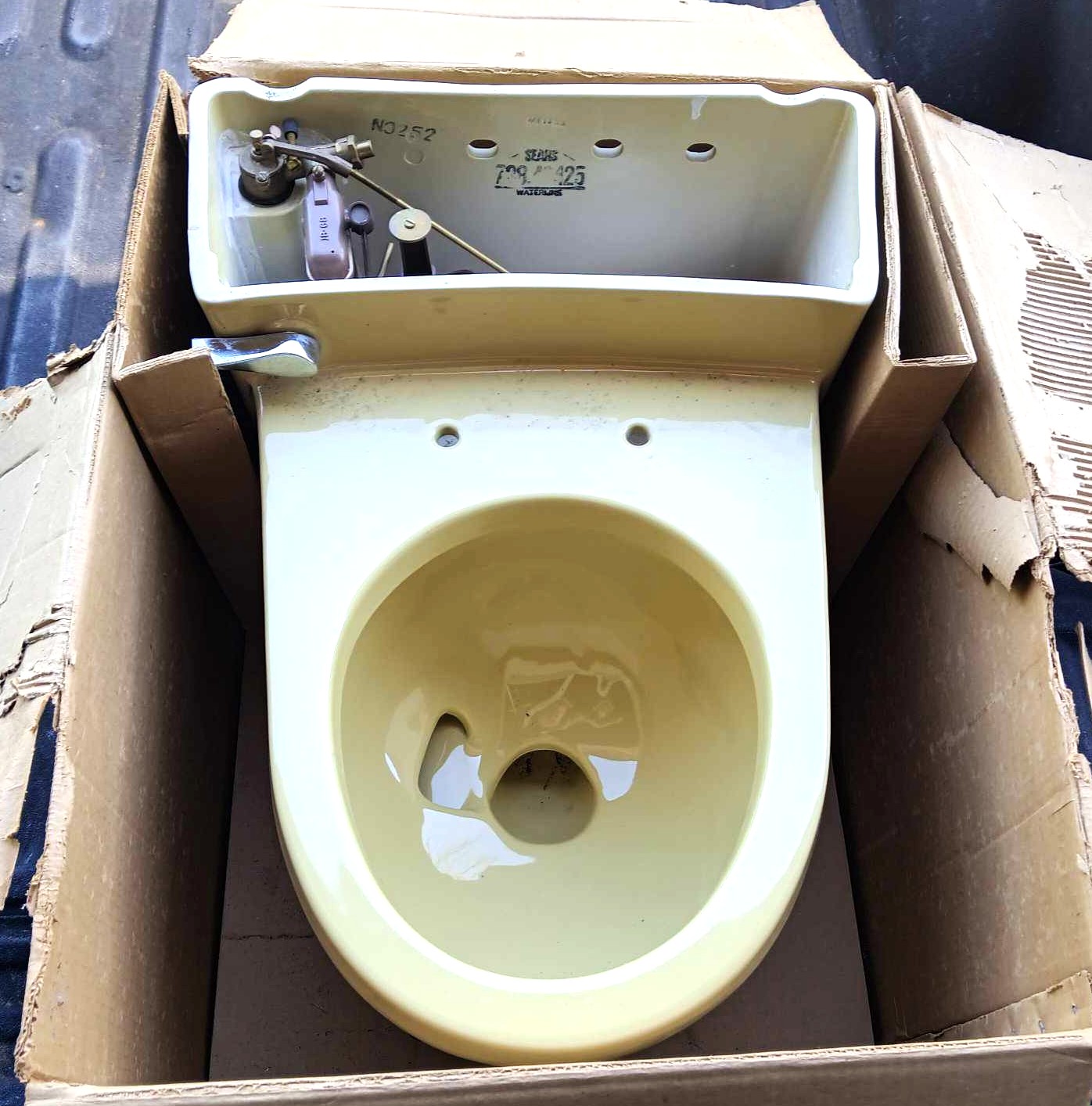 50 YEAR OLD SET OF 1976 SEARS SINK & MATCHING TOILET IN GORGEOUS CITRON YELLOW! ONLY TAKEN OUT OF THE BOXES FOR INSPECTION AND PHOTOGRAPHS!