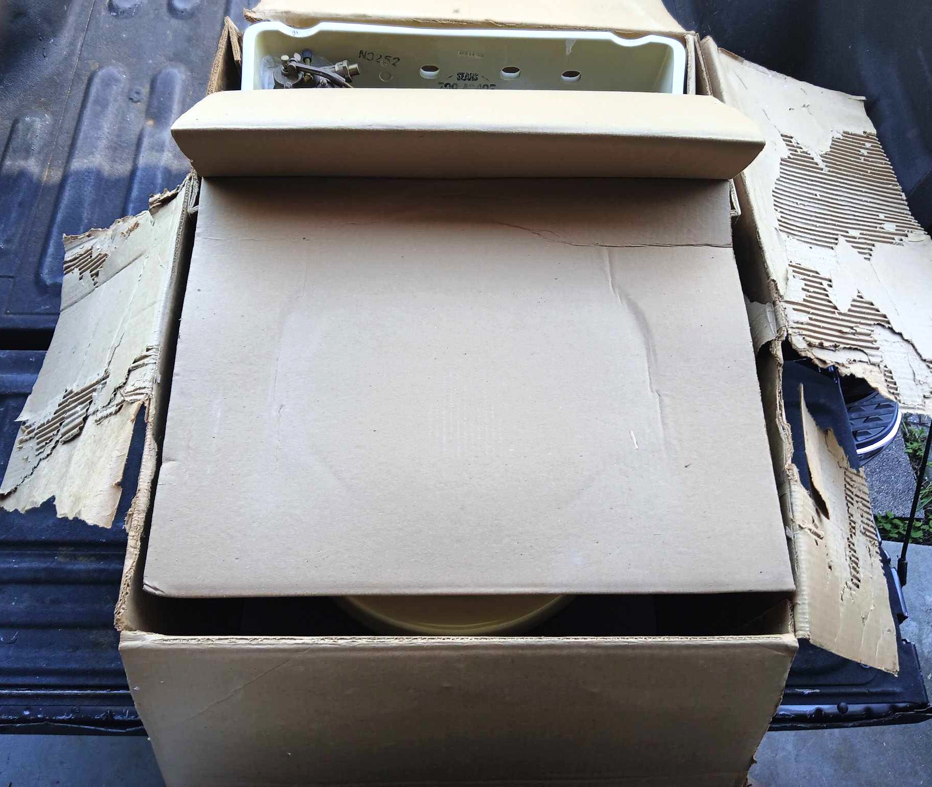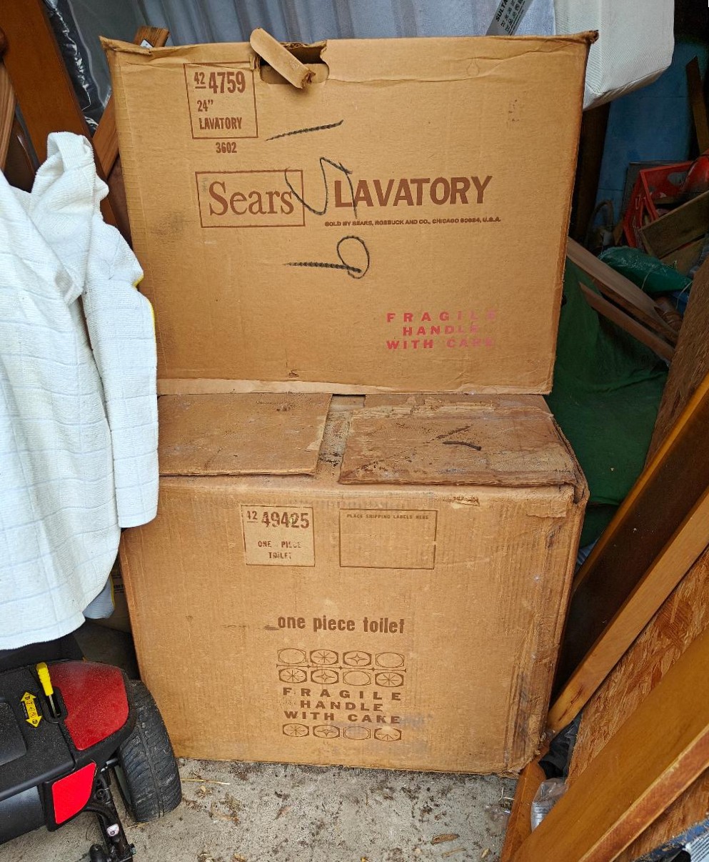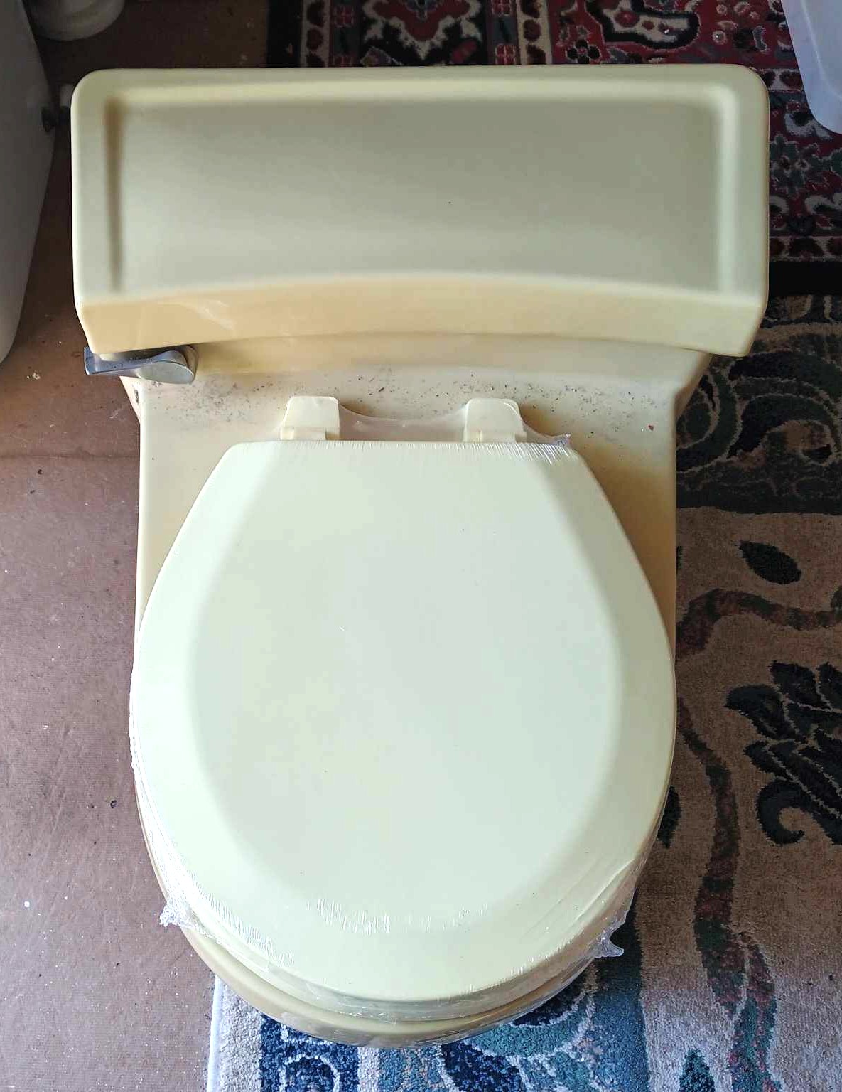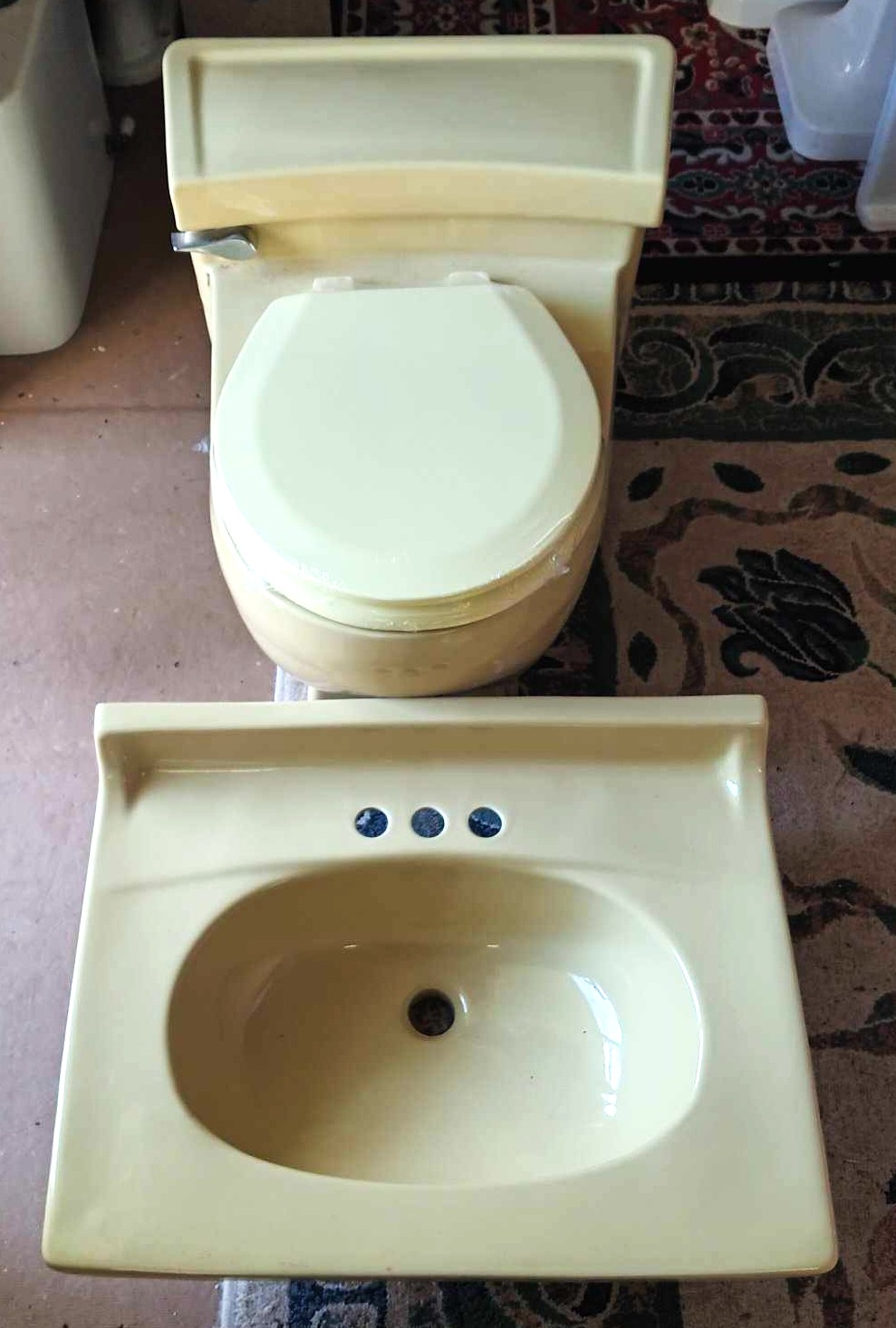 50 YEAR OLD SET OF 1976 SEARS SINK & MATCHING TOILET IN GORGEOUS CITRON YELLOW! ONLY TAKEN OUT OF THE BOXES FOR INSPECTION AND PHOTOGRAPHS!